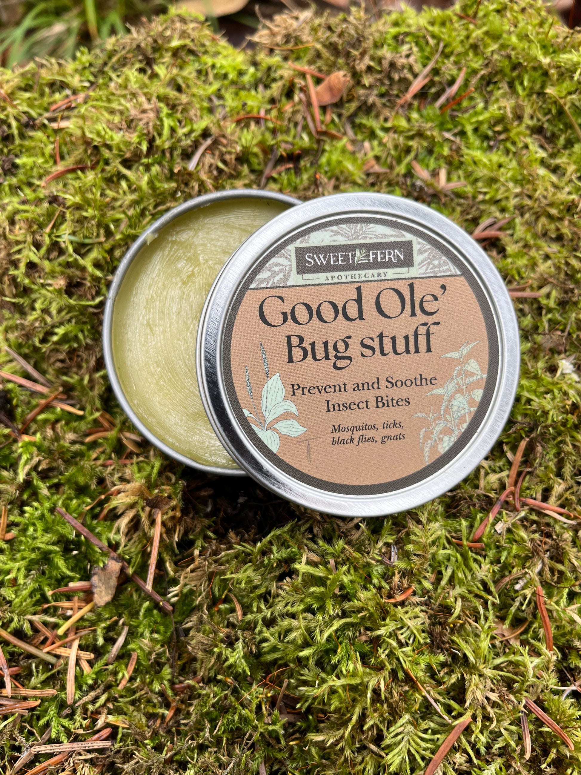 .A gentle, herb-rich salve crafted to help keep pesky bugs away while soothing the irritation they leave behind. Infused with a blend of catnip, wormwood, lemon balm, bracken fern, nettle, and plantain, this formula offers time-honored botanical support for tender, itchy, or reactive skin. A touch of citronella and geranium essential oils provides a soft, natural barrier—mild in scent, safe for kids, and ideal for frequent use.
